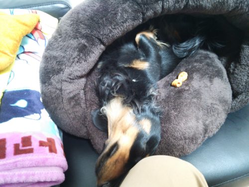 ミニチュアダックスのBBちゃんは遊びたい盛りの男の子 いっぱい遊んで、最近は帰る時に寝かしつける…